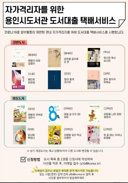 [한국연예축제일보, 유혜경기자] 용인시 도서관이 2일부터 코로나19 자가격리자를 위한 무료 택배 도서대출서비스를 진행한다.