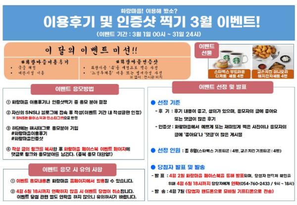 당첨자 발표는 다음달 2일 화랑마을 페이스북을 통해 할 예정이며, 총 8명에게 스타벅스 또는 교촌치킨 기프티콘을 제공한다.