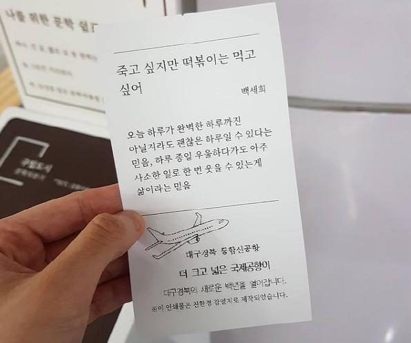 강명숙 대구시 여성청소년교육국장은 “문학자판기의 작품들이 바쁜 일상에 지친 시민들에게 따뜻한 위로가 되어주기를 바라며, 앞으로도 시민들의 독서 생활화를 위한 다양한 방법을 연구하겠다”고 말했다.