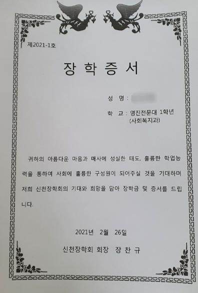 [한국연예축제일보, 유혜경기자] 동구 신천1.2동 신천장학회(회장 장찬규)는 7명의 지역청소년에게 50만원씩 총350만원의 장학금을 전달했다고 2일 밝혔다. 코로나19로 인하여 직접 전달식은 못했지만 장학금을 개인별계좌로 송금하고 장학증서는 장찬규 회장이 개별 수여하였다.