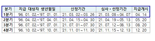 신청 대상은 신청일 기준 경기도에 3년 이상 연속 거주하거나 거주한 일수의 합이 10년 이상이며, 현재 경기도에 주민등록을 두고 있는 1996년 1월2일부터 1997년 1월1일 사이에 출생한 만 24세 청년이다.