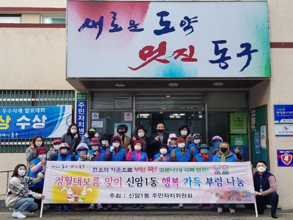 [한국연예축제일보, 유혜경기자] 정월대보름을 맞이하여 신암1동 주민자치위원회(위원장 조해근)에서는 노인일자리사업 참여자 22여 명과 내방 민원인 100여 명에게 ‘코로나19 극복, 행복가득 부럼 나눔’ 행사를 가졌다고 1일 밝혔다.