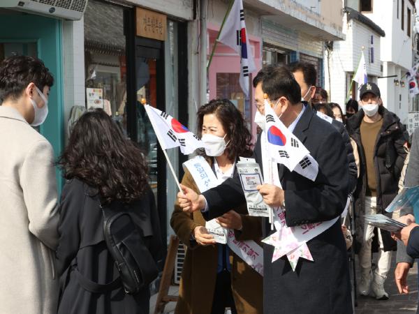 특히 지난달 26일에는 주낙영 경주시장과 황남동 이·통장, 상인, 경주시 새마을회 회원 등 20여명이 황리단길을 직접 찾아, 관광객과 시민을 대상으로 태극기와 태극기가 새겨진 마스크를 나눠주며 3·1절의 숭고한 정신을 되새기는 캠페인도 마련했다.