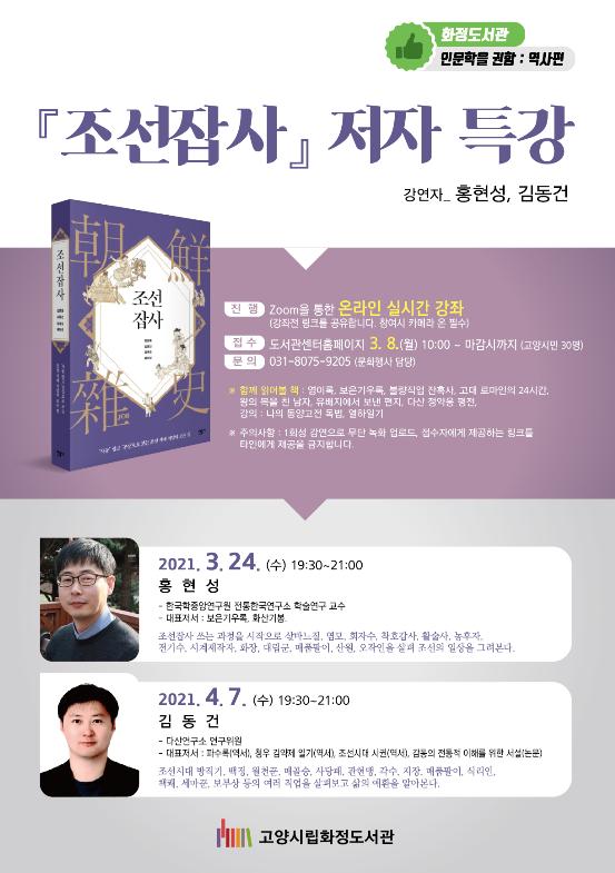 이번 저자특강은 오는 3월 24일과 4월 7일 이틀간 실시간 온라인(ZOOM) 방식으로 열리며, ‘조선잡사’의 공동저자인 홍현성, 김동건 박사 두 사람이 각각 특강에 참여한다.