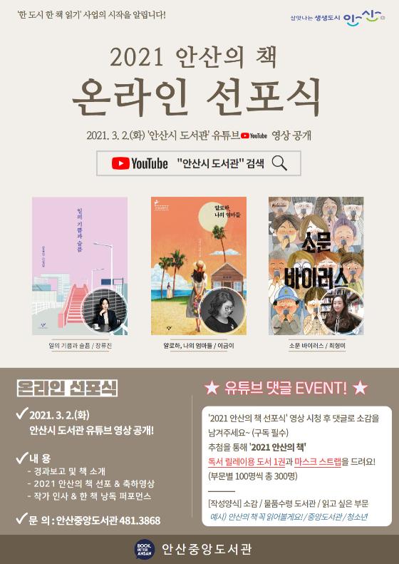 선포식 후에는 작가 3인의 인터뷰 영상이 주 1회 시민들을 찾아갈 예정이며, 이달 16일까지 '2021 안산의 책’ 독서릴레이 첫 주자를 모집하는 댓글 이벤트도 진행된다.