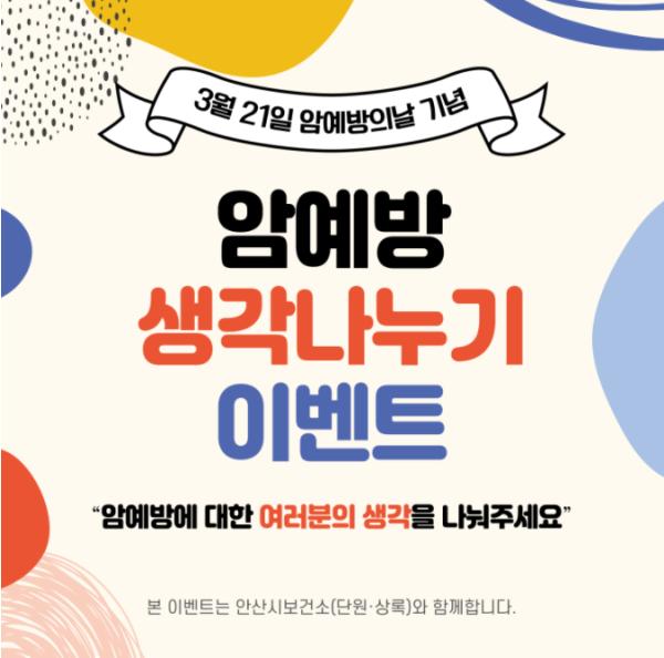 시는 3월21일 ‘암 예방의 날’을 맞아 암 예방의 중요성 및 예방법 등을 안산시 공식 SNS를 통해 경기도민에게 널리 알리고자 추진하게 됐다.