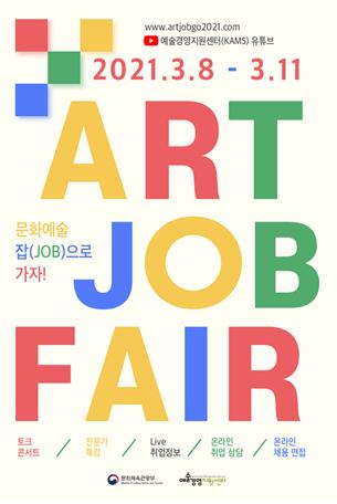 [한국연예축제일보, 이순례기자] 문화체육관광부는 (재)예술경영지원센터(대표 김도일)와 함께 3월 8일부터 11일까지 "2021 문화예술 취업 박람회 - ‘문화예술 잡(JOB)’으로 가자!”를 개최한다. 이번 박람회는 코로나19 확산 방지를 위해 예경 유튜브와 공식 누리집을 통해 온라인으로 진행된다.