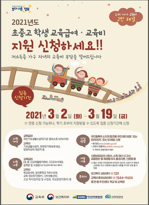 [한국연예축제일보, 서병진기자] 교육부는 저소득층 학생의 실질적 교육기회 보장과 학부모의 교육비 부담 경감을 위해, ‘교육급여 및 교육비 지원’ 집중신청기간을 3월 2일부터 19일까지 운영한다.