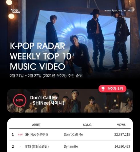 [한국연예축제일보, 장승엽기자] 샤이니의 ‘Don’t Call Me(돈트 콜 미)’ 뮤직비디오는 케이팝 레이더 2021년 9주 차(2월 21일~2월 27일) 차트에서 2,278만 뷰를 기록하며 1위에 올랐다.