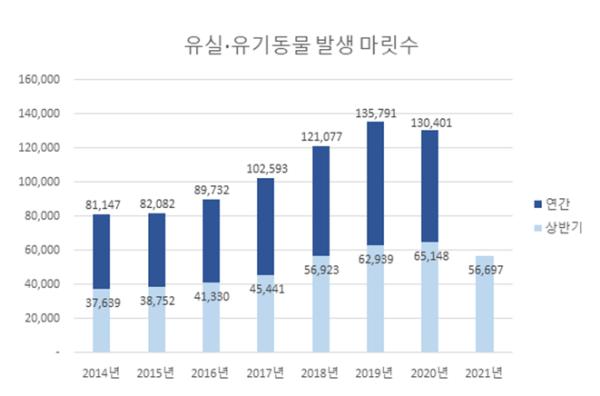 올해 1월부터 6월까지 상반기의 유실·유기동물 발생 마릿수는 56,697마리로 집계됐다. 2020년 상반기(65,148마리)보다 13%(8,451마리) 감소한 수치다.