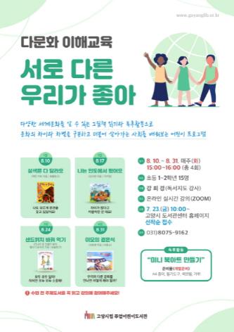 [한국연예축제일보, 전용훈기자] 고양시 주엽어린이도서관은 8월 10일부터 31일까지 온라인 다문화 이해교육「서로 다른 우리가 좋아」를 운영한다.