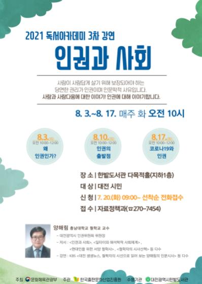 [한국연예축제일보, 전용훈기자] 한밭도서관은 8월 3일부터 매주 화요일(3일, 10일, 17일) 3회 일정으로 개최하는 2021년 독서아카데미 3차 강연 ‘인권과 사회’참가 신청을 20일부터 받는다고 밝혔다.