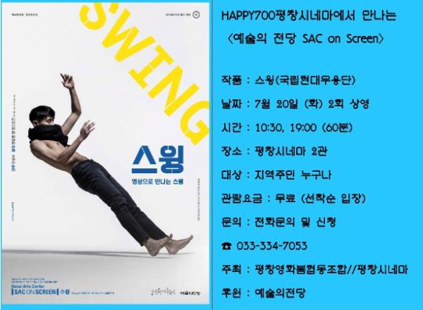 [한국연예축제일보, 전용훈기자] 평창군 ‘HAPPY700평창시네마’에서는 오는 20일 오전 10:30분, 오후 19시 2차례에 걸쳐, 서울 예술의 전당에서 공연한 국립현대무용단의 「스윙」작품을 촬영한 영상물을 상영할 예정이라고 밝혔다.