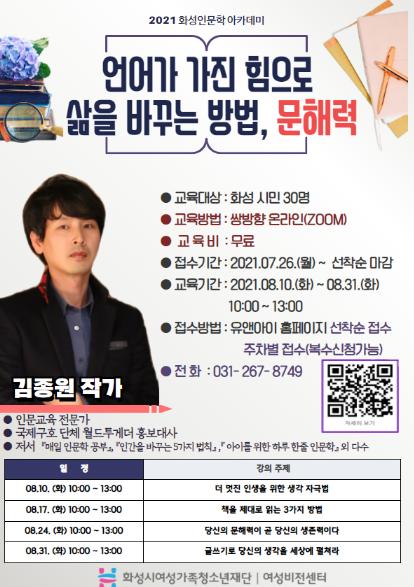 [한국연예축제일보, 전용훈기자] 화성시여성비전센터는 ‘언어가 가진 힘으로 삶을 바꾸는 방법, 문해력’이라는 주제로 8월 10일부터 8월 31일까지 인문학 강좌를 연다. 매주 1회 총 4주간 쌍방향 온라인(zoom)으로 수업을 진행될 예정이다.