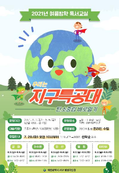 이번 과정의 주제는 ‘우리는 지구특공대! 탄소중립 바로알기’로, 기후 위기 등 환경과 관련된 도서를 읽고 독서 토론, 만들기, 글쓰기 등의 독후 활동 시간을 갖는다.