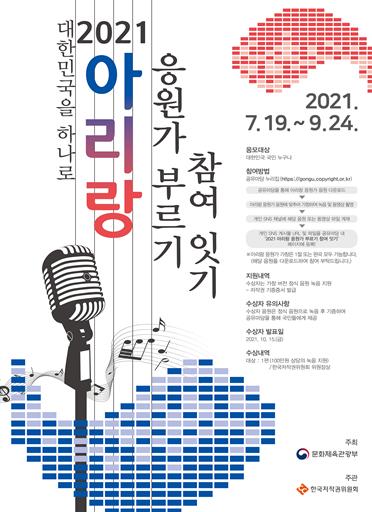‘응원가 부르기 참여 잇기’ 참가자는 ‘2021 아리랑’ 음원을 배경으로 노래를 부른 뒤 해당 녹음본이나 동영상을 누리소통망에 게시하고, 해당 인터넷 영문 주소(URL)를 위원회 공유마당 누리집에 등록하면 된다. 우수 가창자 1명에게는 위원회 위원장상 수여와 함께 정식 음원 녹음 및 제작을 지원한다. 해당 음원은 저작권 기증 절차를 거친 후 11월에 추가로 공개될 예정이다.