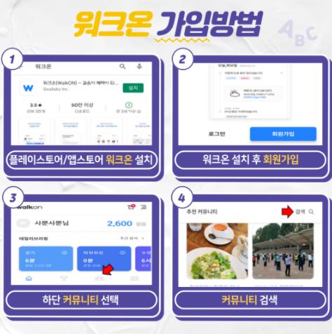 챌린지 참여를 위해서는 스마트폰 플레이스토어 또는 앱스토어에서 ‘워크온’ 설치 후 김천시 공식 커뮤니티(소 그룹 읍면동 선택) 가입, 김천시 챌린지에서 ‘참여하기’를 누른 후 휴대폰을 소지하고 걸으면 된다. 챌린지 기간 동안 목표 걸음 수 10만 5천보를 채우게 되면 자동 응모 되며 당첨자는 추첨을 통하여 8월 중 워크온 앱 내 공지사항에 게시될 예정이다.
