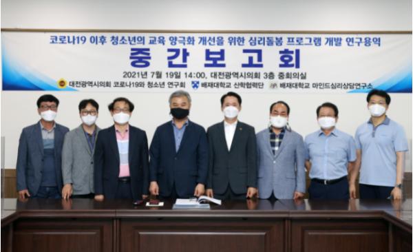 [한국연예축제일보, 안성경기자] 대전시의회 코로나19와 청소년 연구회(회장 정기현 의원)는 19일 시의회 중회의실에서‘코로나19 이후 청소년의 교육 양극화 개선을 위한 심리돌봄 프로그램 개발 연구용역 중간보고회’를 개최했다.