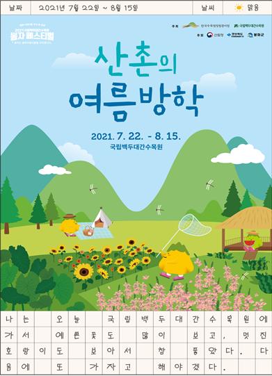 또한 대형 잠자리채와 밀짚 코자 포토존이 설치되고, 엄마랑 꽃꽂이, 할아버지의 옷장, 산촌의 추억일기 등 다양한 체험프로그램이 진행될 예정이다. 이밖에도 어린이를 위한 호랑이인형극, 여름방학 버블쇼를 비롯해 숲속 음악회, 여름 꽃 전시회 등 볼거리도 다양하다.
