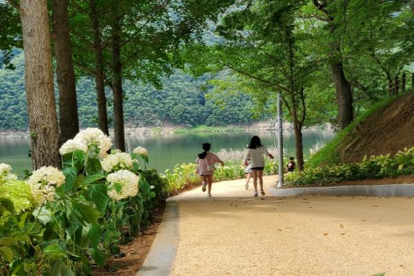 군은 아직 공사 진행 중에 있지만 산책로 모단가게 ~ 수질측정소 구간(약 500m) 일부 개방했다. 이곳을 따라가면 많은 수국과 호스타, 안개나무, 송엽국 등이 식재 되어 꽃향기를 만끽하며 대청호반을 즐길 수 있다.