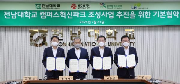 [한국연예축제일보, 이왕신기자] LH 김현준 사장은 오늘 전남대학교 본관에서 이용섭 광주광역시장, 문인 광주광역시 북구청장, 정성택 전남대학교 총장과 함께 전남대학교 캠퍼스혁신파크 사업추진을 위한 기본협약을 체결했다.