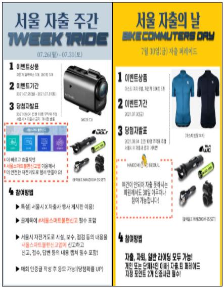 매월 넷째 주 일주일간은 ‘서울시x자출사’ 주간으로 정하고, 달마다 테마를 정해 회원들이 미션을 수행하면 경품을 증정한다. 주간 중 금요일은 ‘자전거 출퇴근의 날’로 정해 자전거 출퇴근 인증 미션도 한다. 시는 참여 회원들을 선정해 자전거 블랙박스, 전조등 등 자전거와 관련된 경품을 증정해 참여를 이끌어낸다.