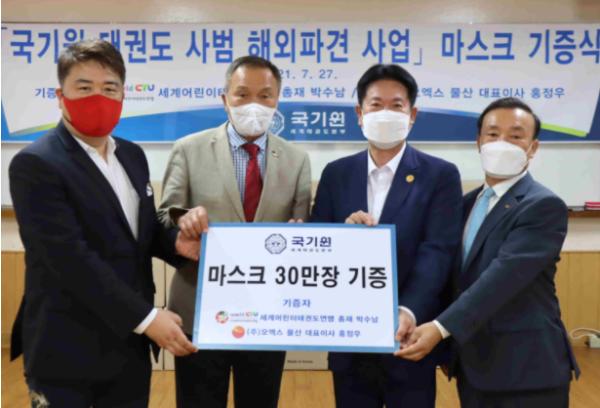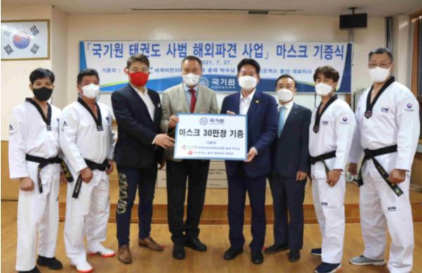 7월 27일 오전 11시 30분 국기원 강의실에서 이동섭 원장을 비롯한 국기원 임직원, 해외 파견사범 등과 박수남 세계어린이태권도연맹 총재, 홍정우 ㈜오엑스 물산 대표이사 겸 대한민국어린이태권도연맹 회장, 이상기 세계어린이태권도연맹 부총재가 참석한 가운데 ‘국기원 태권도 사범 해외파견 사업 마스크 기증식‘이 진행됐다.