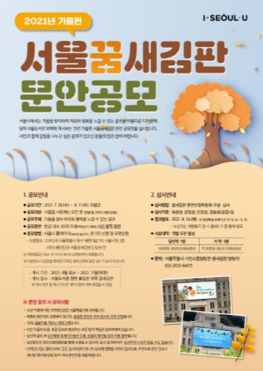 [한국연예축제일보, 임정선기자] 2021년 가을을 앞두고, 서울시는 새로운 계절을 맞아 여유와 행복을 느낄 수 있는 글귀를 주제로 한 ‘서울꿈새김판 문안 공모’를 8월 11일까지 ‘서울시 홈페이지’접수 및 우편접수로 진행한다.