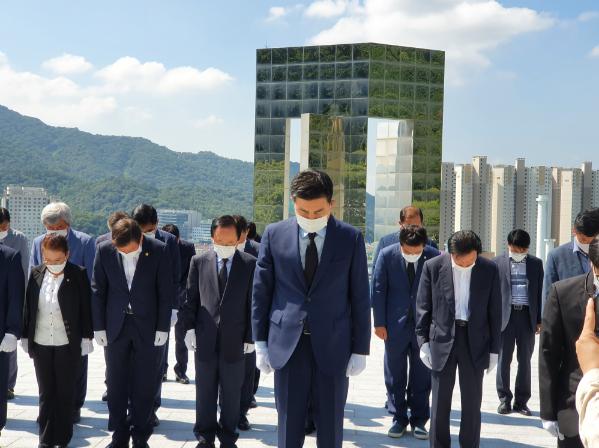 김의원은 앞서 이날 오전 국립 3.15민주묘지를 찾아 참배하면서 선열들께 “공존의 씨앗을 꼭 심겠습니다”라고 썼다.