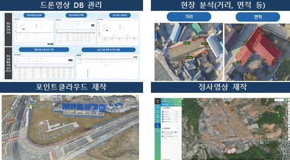 특히, 플랫폼으로 제작된 정사영상을 지형도나 지적도, 설계도면 등과 중첩해 토공의 단면 및 물량, 경사면 등을 분석하는 데 용이하며, 입체적 비교·분석도 가능하다.