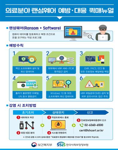 구체적으로는 지난 2020년 7월 ‘의료기관 랜섬웨어 예방 대응 안내서 및 퀵매뉴얼’을 제작·배포하였으며, 국내 의료기관 대상 공격 현황을 분석하여 대응보고서를 발간·배포(매분기)하고 있다.