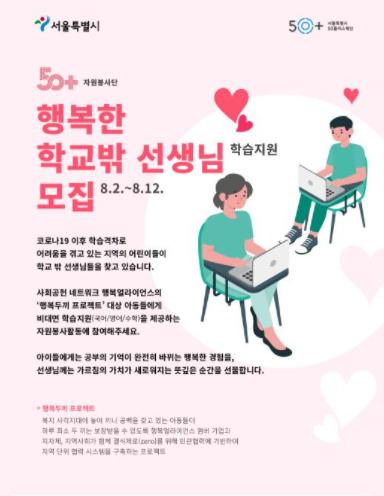 서울시50플러스재단은 이와 같은 내용의 자원봉사에 참여할 ‘행복한 학교밖 선생님’을 공개 모집한다고 밝혔다.