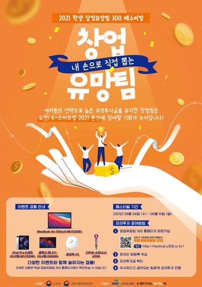 [한국연예축제일보, 유혜경기자] 교육부와 과학기술정보통신부는 한국연구재단(이사장 노정혜), 한국청년기업가정신재단(이사장 황철주)과 함께 ‘2021 학생 창업유망팀 300 축제(페스티벌)’을 개최한다.