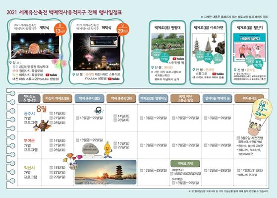 모든 행사는 온라인과 현장행사로 나누어 진행하며, 코로나19 단계별 상황에 시시각각 대응할 계획이다. 13일 개막식과 29일 폐막식을 포함하여 축전의 15개 프로그램은 축전 유튜브에서도 시청할 수 있다. 일부 행사는 안전한 방역을 위하여 사전 예약제로 진행된다. 사전예약과 축전의 일정에 관한 더 자세한 정보는 세계유산축전 백제역사유적지구 누리집에서 확인하면 된다.