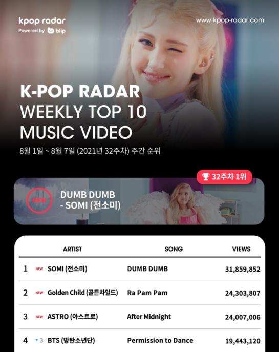 전소미의 세번째 디지털 싱글인 ‘DUMB DUMB(덤덤)’ 뮤직비디오는 케이팝 레이더 32주차 집계 기간 (8월 1일 ~8월 7일) 동안 3,185만 뷰를 기록하며, 컴백과 동시에 1위를 차지했다.