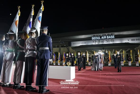 문 대통령 부부는 서울공항에 서훈 국가안보실장, 서욱 국방부 장관, 유영민 비서실장과 함께 홍범도 장군의 유해를 정중히 맞이했다. 봉환식에는 한국광복군으로 항일운동에 참여한 후 한국전쟁에도 참여하여 1952년 화랑무공훈장과 1990년 건국훈장 애족장을 받은 김영관 애국지사도 함께했다.