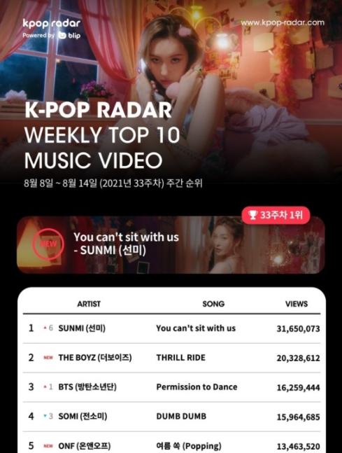 선미의 신곡 ‘You can’t sit with us(유 캔트 싯 위드 어스)’ 뮤직비디오는 케이팝 레이더 2021년 33주 차 집계 기간(8월 8일~8월 14일) 동안 유튜브 조회수 3천1백만 뷰를 추가하며 케이팝 레이더 주간 유튜브 조회수 차트 1위를 차지했다.