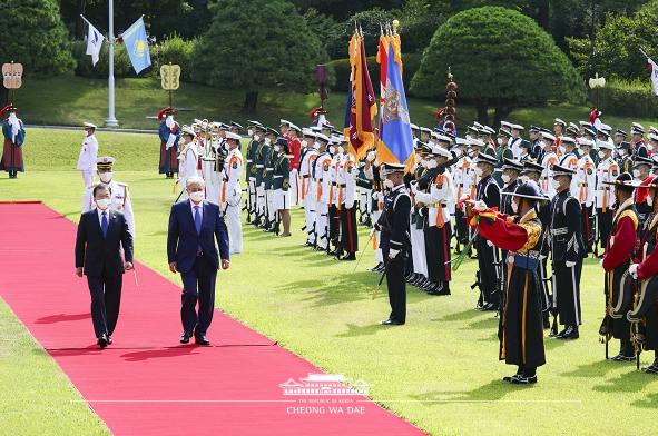[한국연예축제일보, 김재만기자] 문재인 대통령은 17일 오전 10시, 청와대 대정원에서 카심-조마르트 토카예프 카자흐스탄 대통령을 맞이했다.