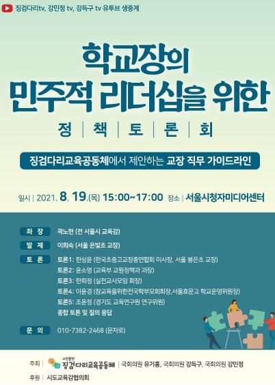 [한국연예축제일보, 허난세기자] 강민정 의원(열린민주당 원내대표, 교육위원회)은 더불어민주당 유기홍, 강득구 의원, 징검다리교육공동체와 함께 오는 8월 19일 오후 15시 ‘학교장의 민주적 리더십을 위한 정책 토론회’를 공동주최한다. 전국시도교육감협의회가 후원하는 이번 토론회는 코로나19 확산에 따른 거리두기 준수를 위해 유튜브 채널 ‘강득구TV’, ‘강민정TV’, ‘전국시도교육감협의회’ 에서 생중계하는 온라인 토론회로 진행된다.