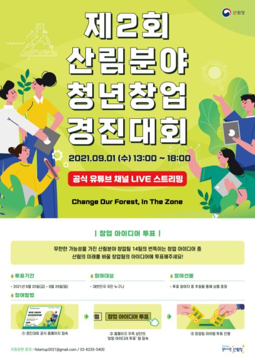 [한국연예축제일보, 윤희영기자] 산림청은 ‘제2회 산림분야 청년창업경진대회’의 온라인 대국민 투표를 8월 20일부터 8월 29일 자정까지 10일간 경진대회 누리집에서 진행한다.