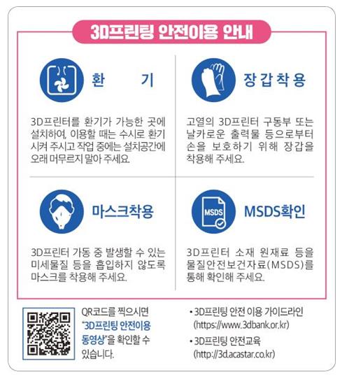 과기정통부는 그 간 전문가 검토를 거쳐➀마스크ㆍ장갑 등 보호구 착용, 작업 시작 전부터 완료 후까지 주기적(최소 1시간 당 5분 이상) 환기, 물질안전보건자료(MSDS)를 통한 3D 프린팅 소재 원재료 확인 등 안전한 이용을 위한 안내 동영상과 주의사항이 표시된 스티커를 제작하였다.