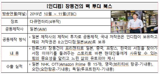 [한국연예축제일보, 윤희영기자] 방송통신위원회가 지난 5월 공모한 「2021 해외 우수 공동제작 대상(大賞)」심사 결과, 인디컴의 ‘장동건의 백 투더 북스’가 대상의 영광을 안았다.