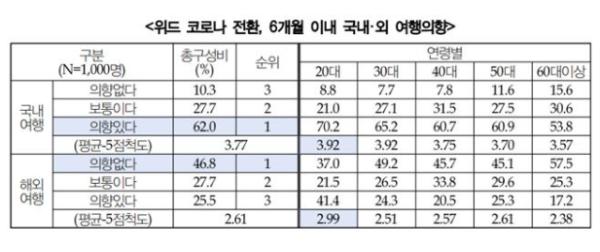 연령별 여행의향을 5점 만점으로 봤을 때 국내여행에서는 20대가 3.92점으로 가장 높고, 60대 이상이 3.57점으로 가장 낮았으나 모든 연령대가 3.5점 이상이었다. 반면 해외여행에서는 최고점인 20대가 2.99점으로 모든 연령대가 3점 미만이었다.