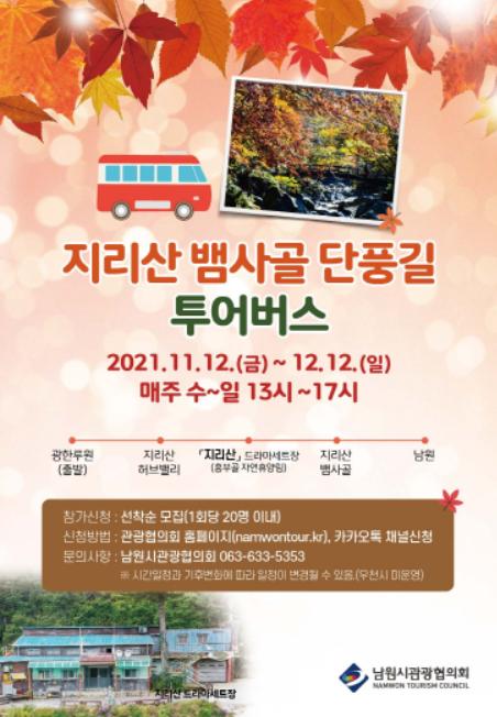 [한국연예축제일보, 이청기자] 남원시관광협의회에서는 단풍길 따라 남원의 아름다운 경관을 둘러볼 수 있는‘지리산 뱀사골 단풍길 투어버스’를 오는 11월 12일부터 12월 12일까지(매주 수~일, 13:00~) 한달간 운영한다.