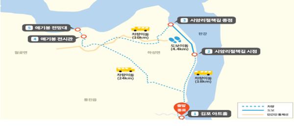 먼저 ‘김포’ 구간은 총 47㎞로, 시암리철책길, 애기봉평화생태공원 등의 코스로 이뤄져 있으며, 특히 지난달 7일 개장한 애기봉 평화생태공원 전망대에서는 북한 개풍군 선전마을과 송악산 관망이 가능하다.