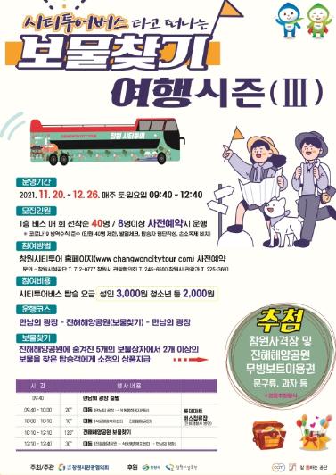 [한국연예축제일보, 이청기자] 창원시는 이달부터 단계적 일상회복이 시작된 가운데 그동안 거리두기로 지쳤던 시민들에게 특별한 체험 기회를 선물하면서 창원관광을 홍보하기 위해 ‘시티투어버스 타고 떠나는 보물찾기 여행 시즌Ⅲ’ 참가자를 모집한다고 15일 밝혔다.