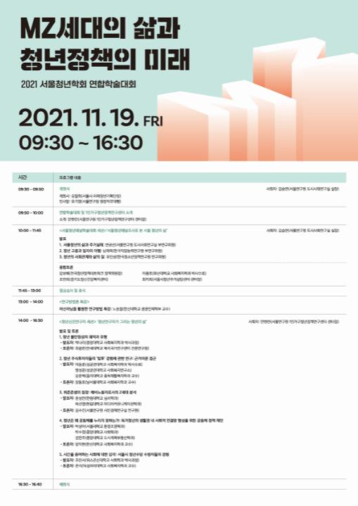 [한국연예축제일보, 임정선기자] 서울시 미래청년기획단과 서울연구원은 11월 19일 오전 9시 30분 서울연구원 대회의실에서 ‘MZ세대의 삶과 청년정책의 미래’를 주제로 2021 서울청년학회 연합학술대회를 개최한다.