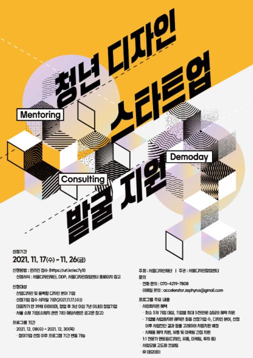 청년 스타트업 발굴 지원사업은 기업가치 제고 전문 액셀러레이터 제피러스랩이 파트너사로 참여하고 있으며, 청년 디자인 스타트업이 선정되면 분야별 전문가와 함께 기업의 성장을 도울 예정이다,