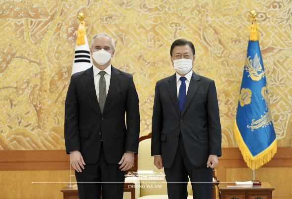 [한국연예축제일보, 김재만기자] 문재인 대통령은 오늘 청와대에서 리처드 해쳇(Richard Hatchett) 감염병혁신연합(CEPI) 대표를 접견하며 “한국은 여러 종류의 백신을 위탁생산함으로써 기여하고 있는데, 거기에 만족하지 않고 반드시 우리 기술로 우리의 백신을 개발, 생산해 내는 것을 국가적인 목표로 삼고 있다”고 강조했다.