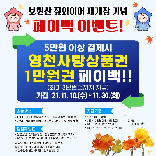 페이백 이벤트는 짚와이어 이용 금액이 5만원 이상인 고객에게 금액의 일부를 영천사랑상품권으로 돌려주는 이벤트이다.